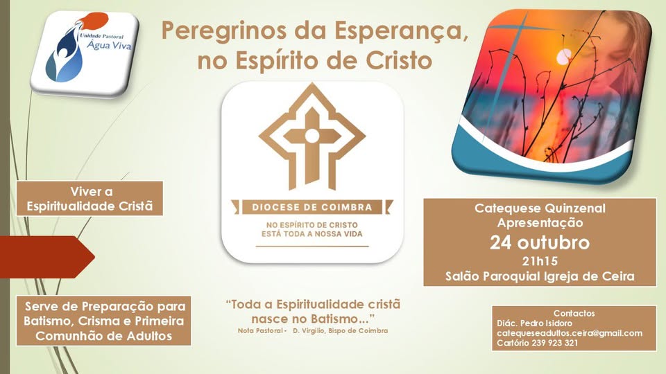 No dia 24 de outubro realiza-se a Sessão de apresentação e de abertura do ano da Catequese quinzenal de Adultos na Unidade Pastoral Água Viva, no Salão Paroquial da Igreja de Ceira.